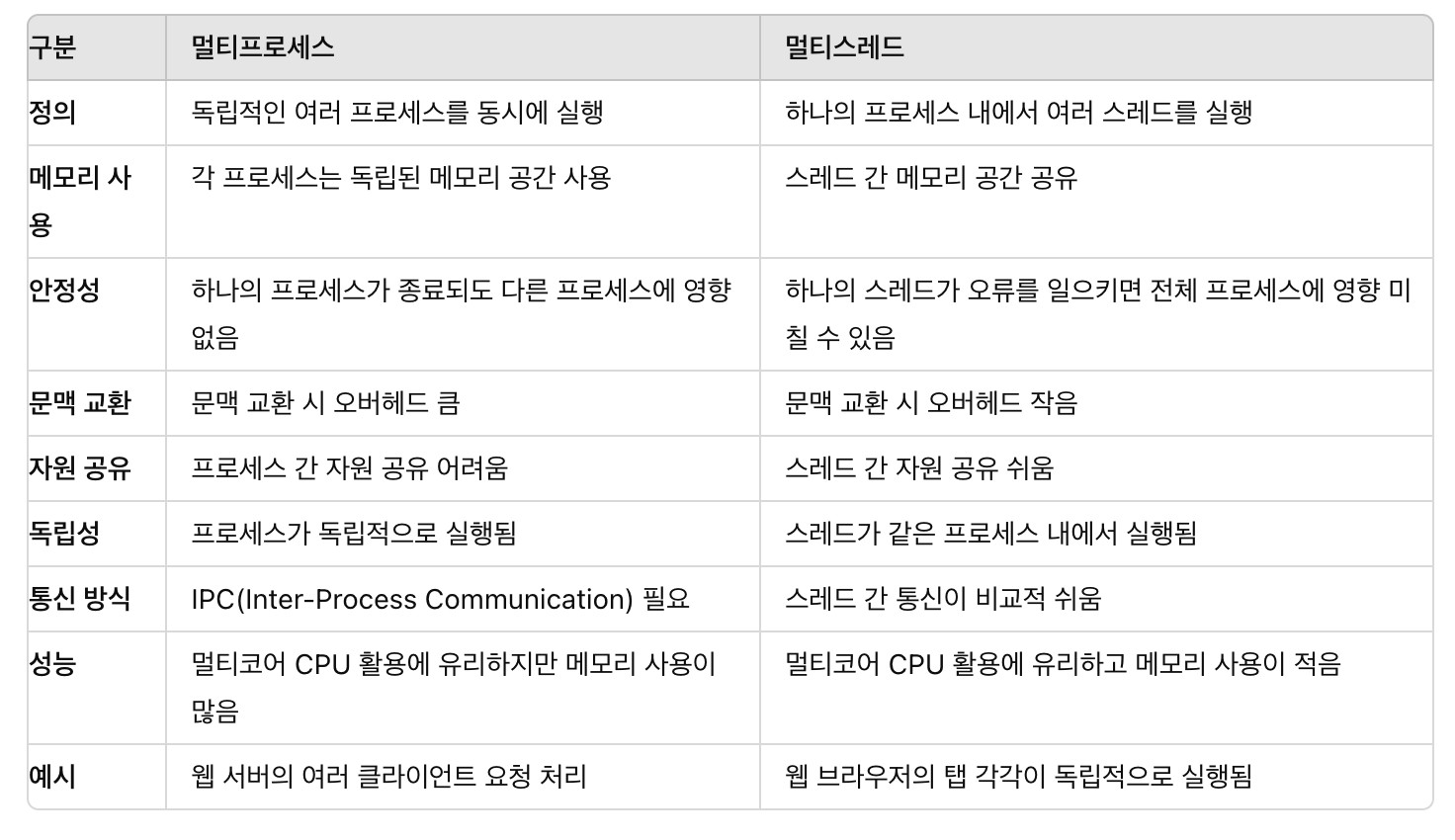 멀티 스레드 : 동일한 메모리 공유하기 때문에 교착상태가 발생할 수 있다.