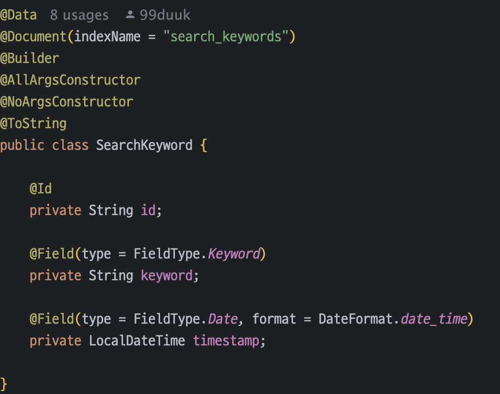 es 인덱스에서는 사용하지만 MySQL 테이블에서는 사용하지 않는 필드에 @Transient 어노테이션을 사용해 정의했다.