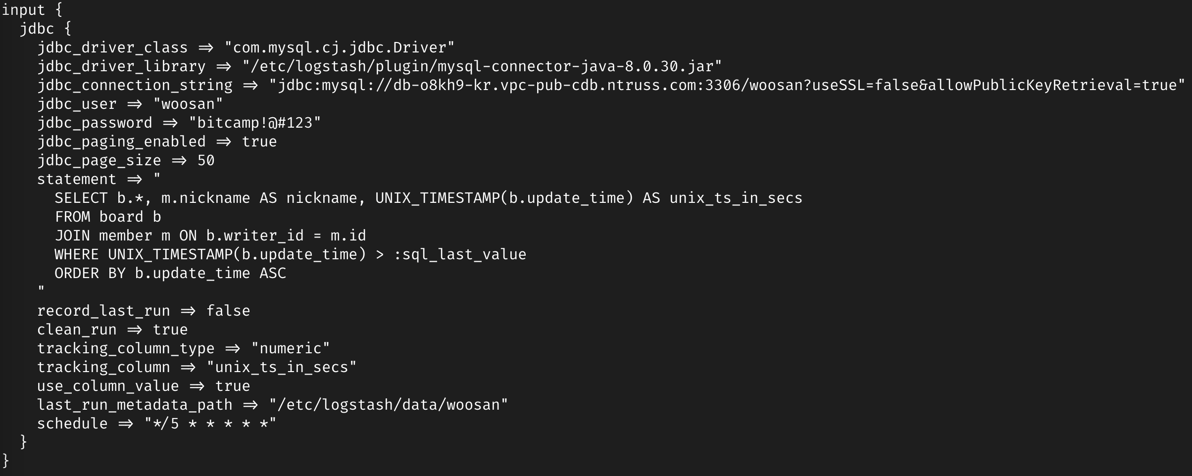 jdbc_connection_string => "jdbc:mysql://db-o8kh9-kr.vpc-pub-cdb.ntruss.com:3306/woosan?useSSL=false&allowPublicKeyRetrieval=true"