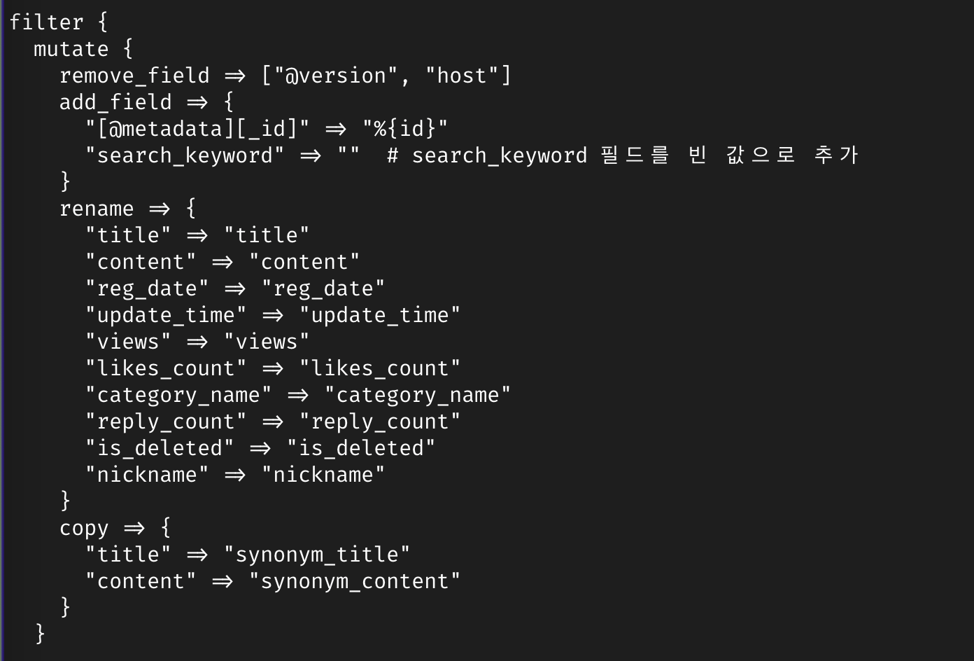 초성 검색을 위해 title, content 컬럼의 문자열 초성을 추출해 연동시에 각각 korean_title과 korean_title 필드에 추가해주도록 설정했다.