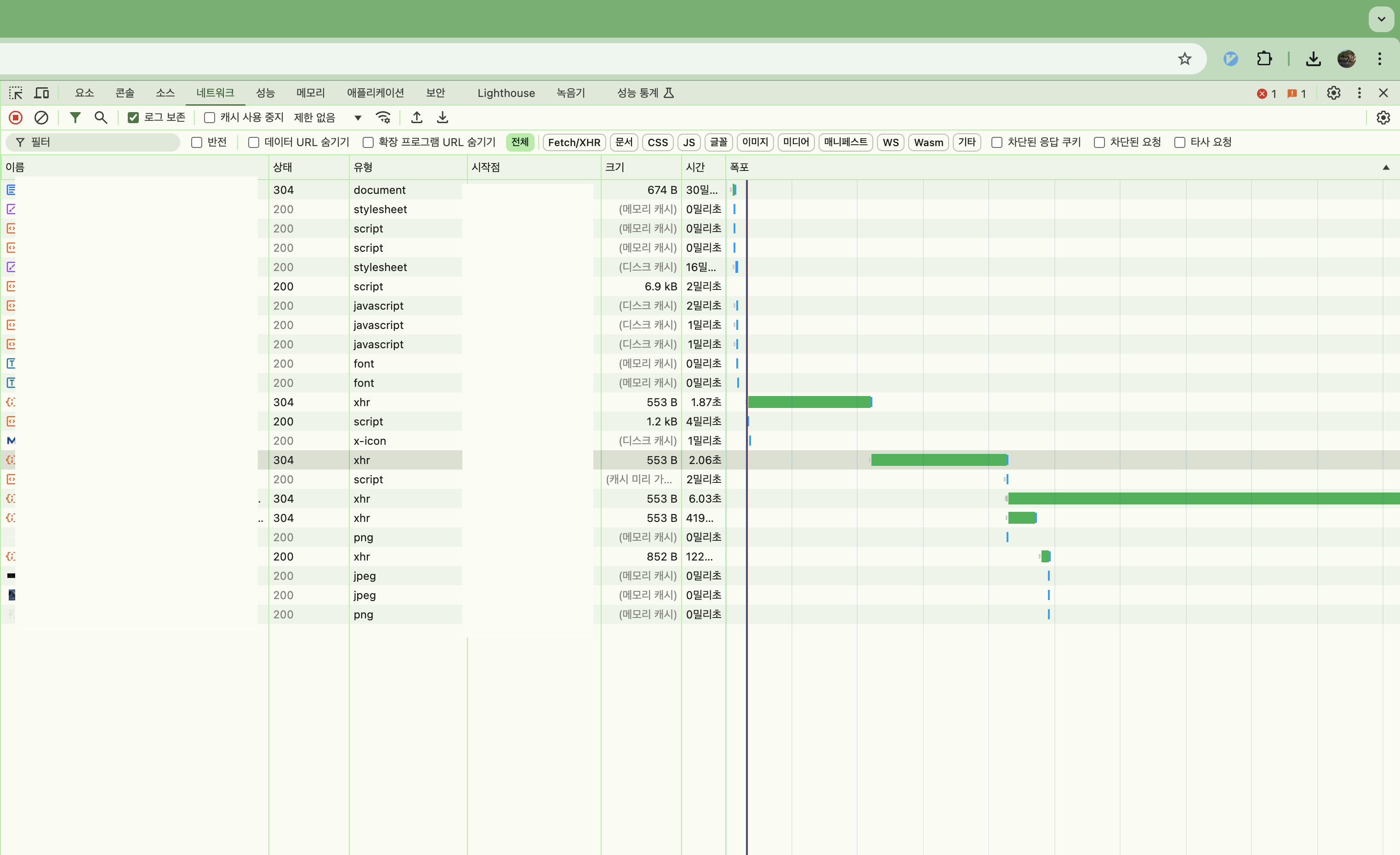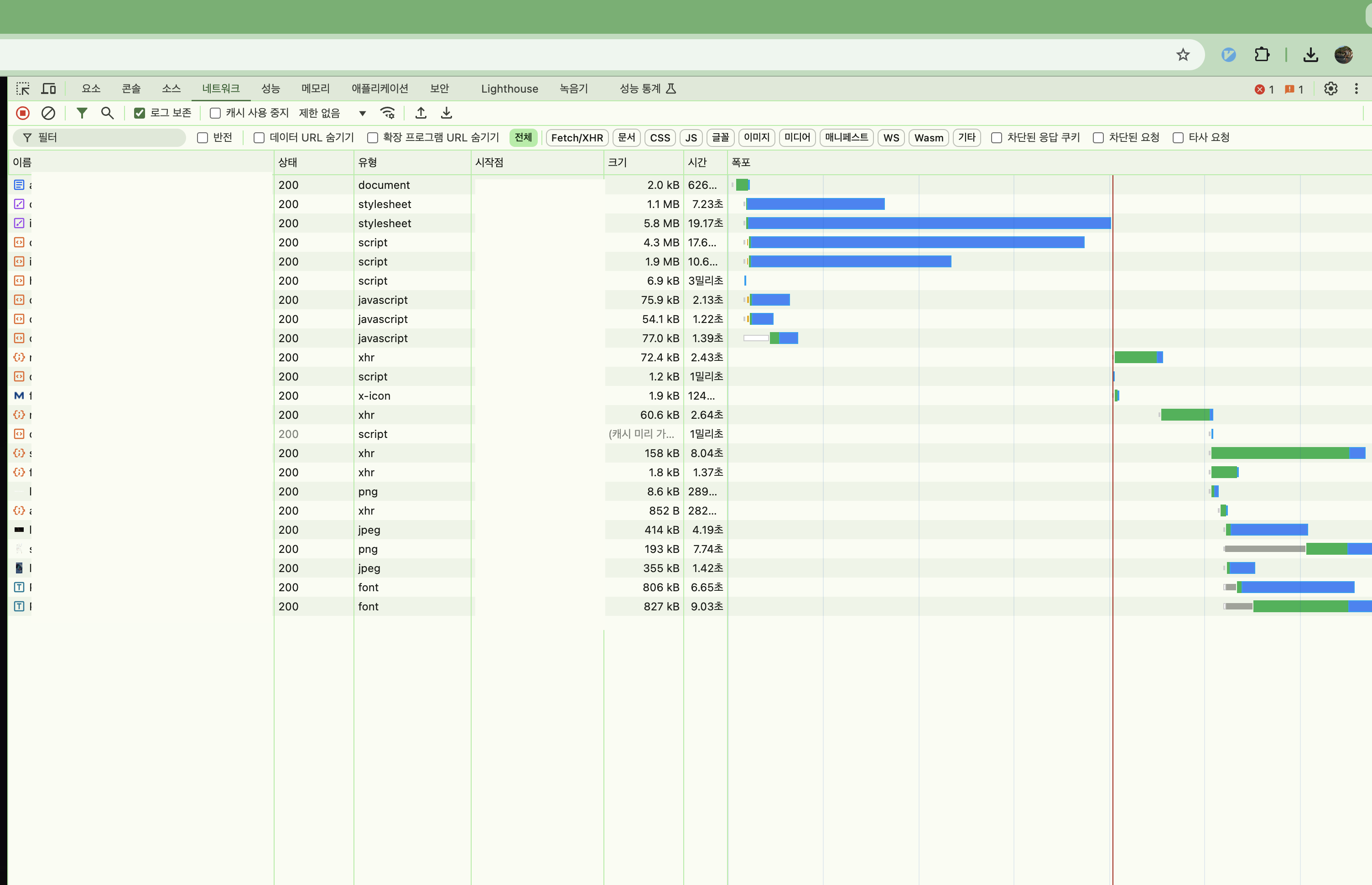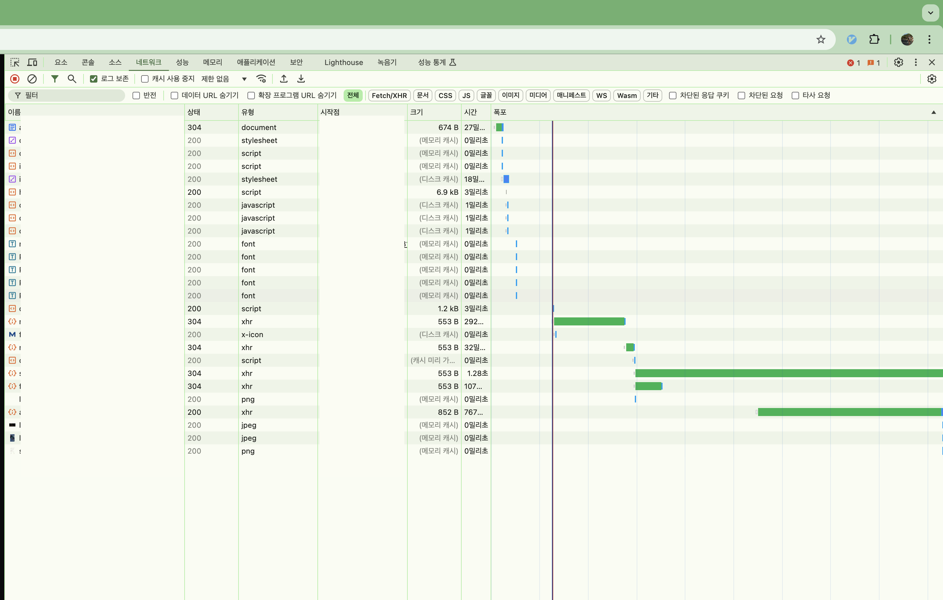 네트워크 들어가보니 정적 리소스가 하나도 캐싱되지 않았다.
