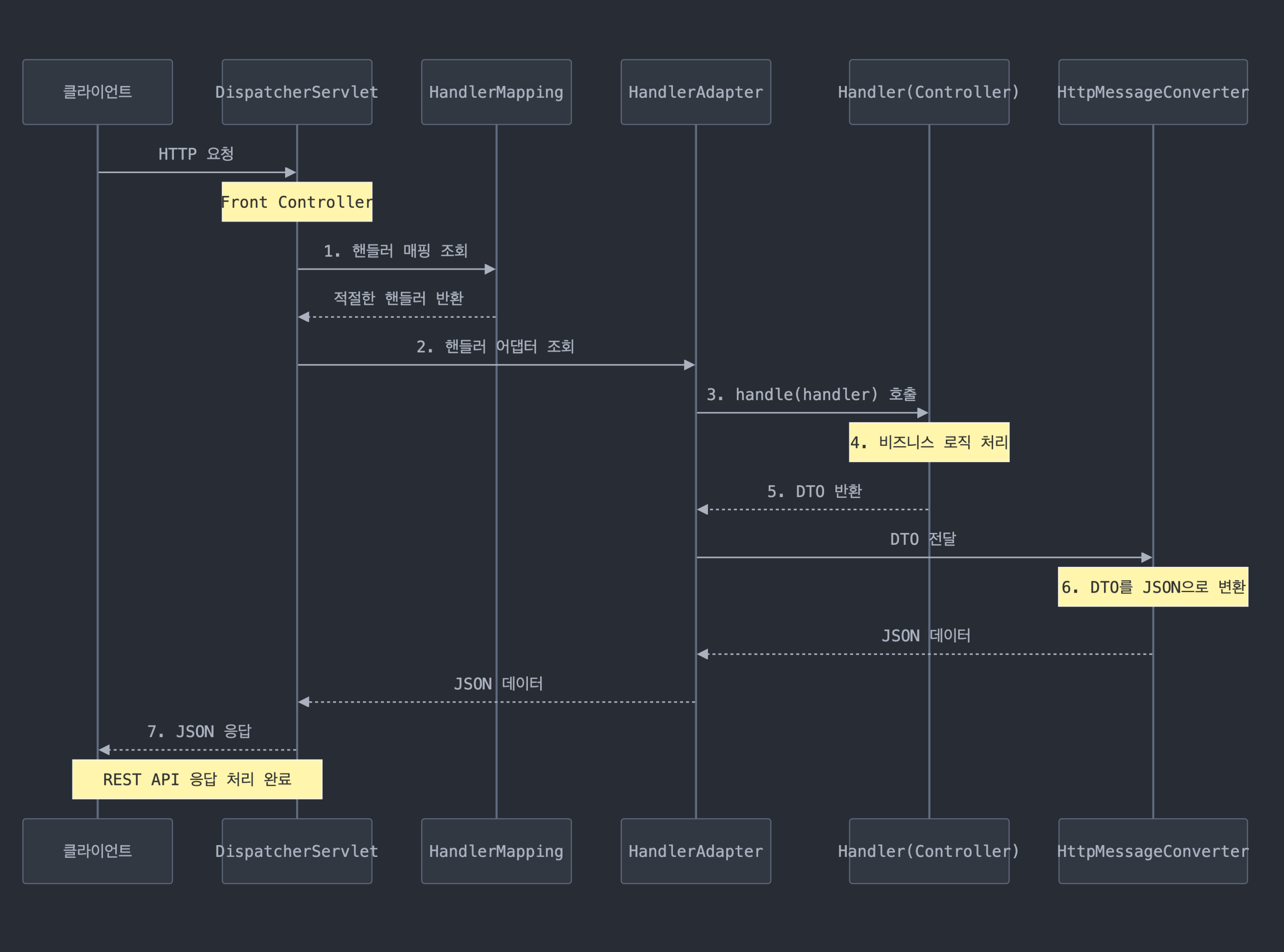 (이 구조에서는 ViewResolver와 View가 제거되었고, 대신 HttpMessageConverter가 DTO를 JSON으로 변환하는 역할을 담당함)