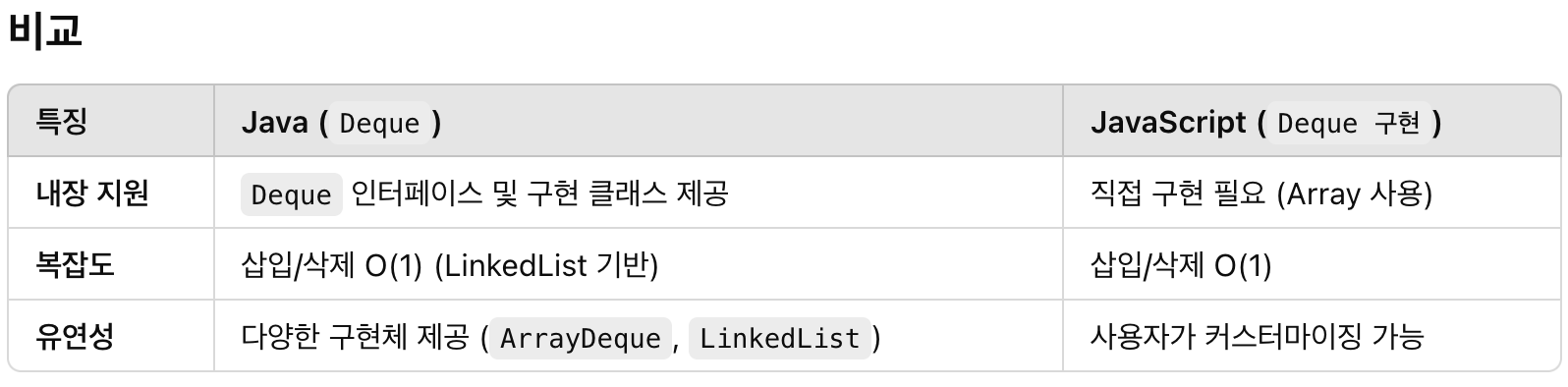 JavaScript에는 기본적으로 Deque 자료구조를 제공하지 않지만, 배열(Array)을 사용하여 구현할 수 있다.