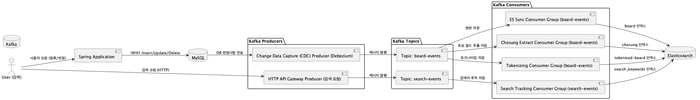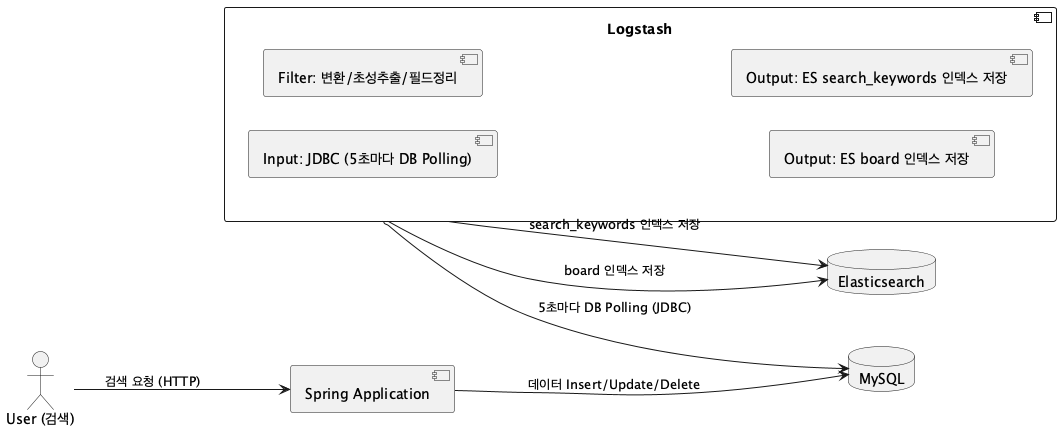 하지만 이 구조는 기본적으로 주기적인 폴링(Pull) 기반이었고, 하나의 Logstash 프로세스가 모든 역할(동기화, 초성추출, 검색어 저장 등)을 담당하는 구조였다.