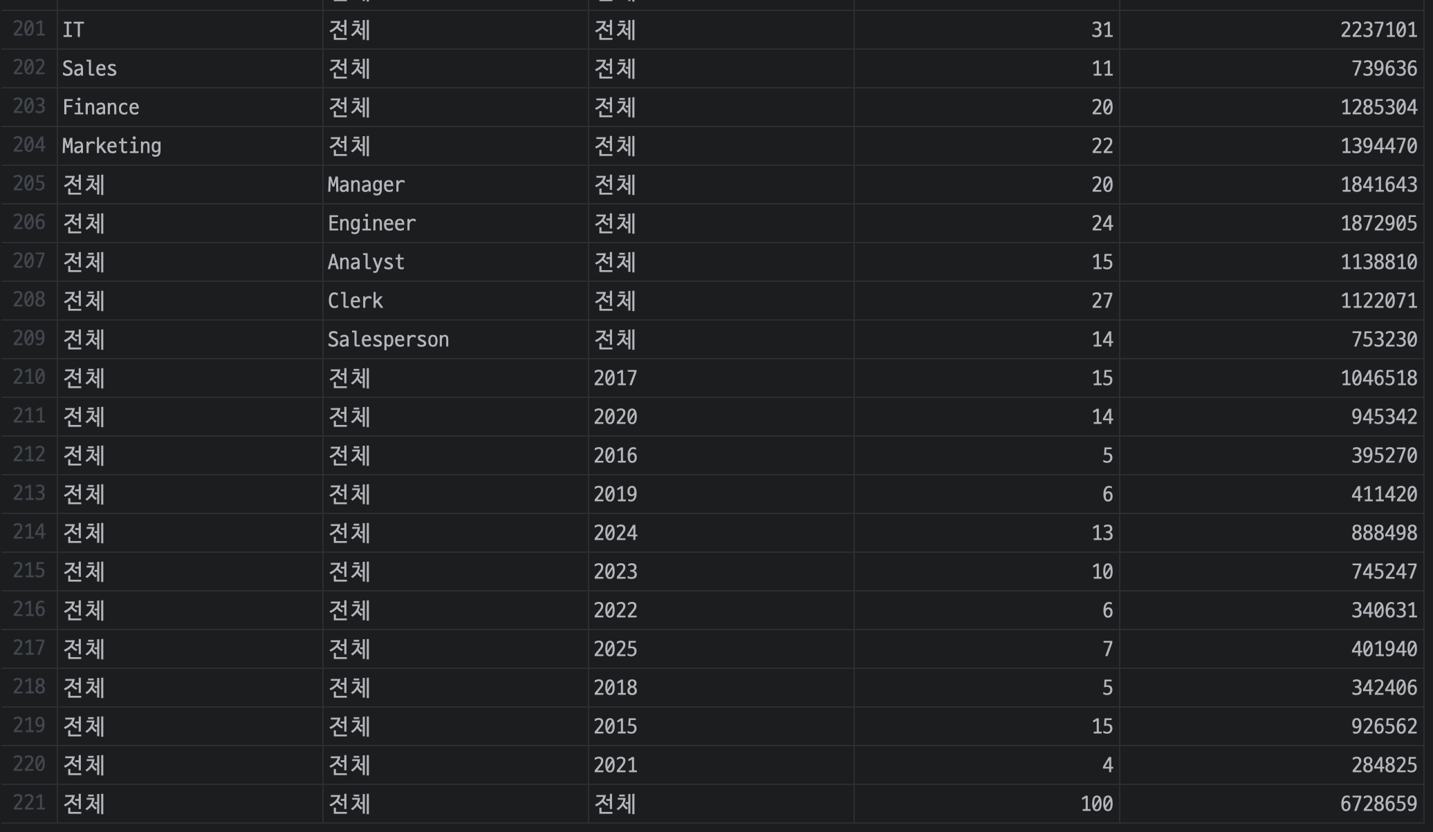 SELECT '전체' AS dept_name, '전체' AS job_title, '전체' AS hire_year,