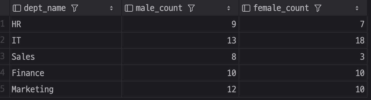 CASE WHEN e.gender = 'M' THEN 1 ELSE 0 END 표현식은 해당 직원이 남성일 경우 1, 아니면 0을 반환한다. SUM()을 씌우면 그 부서의 남성 직원 수 합계가 구해진다.