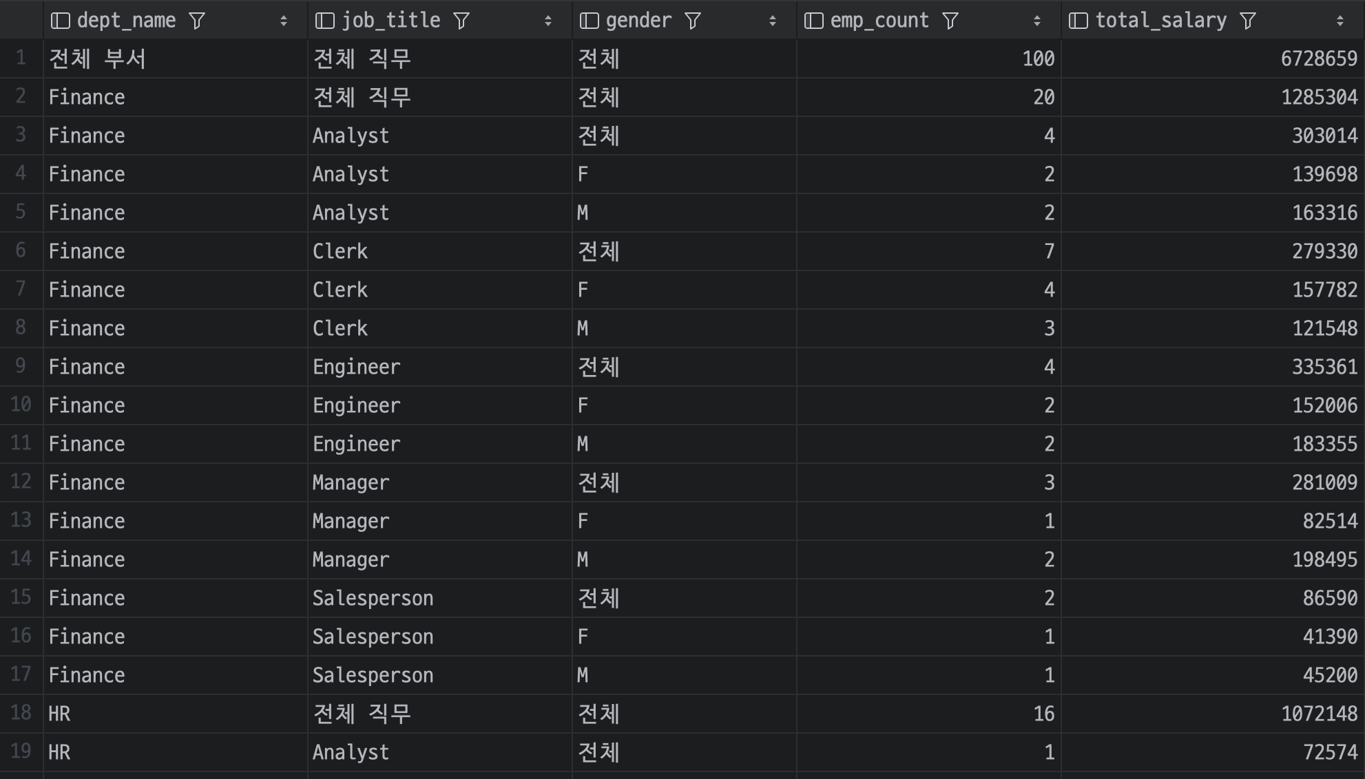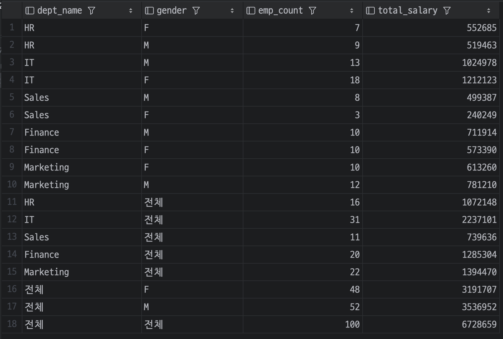 - 성별별 전체 (세 번째 SELECT): 전체 회사를 성별로 구분한 합계 (부서 무관)