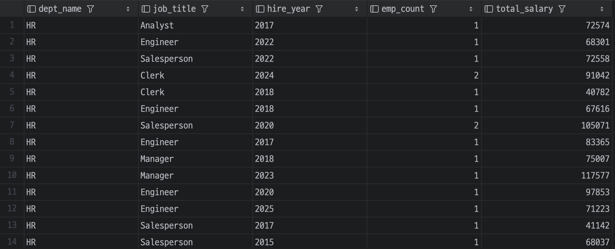 -- (dept_name, job_title, hire_year): 개별 데이터.