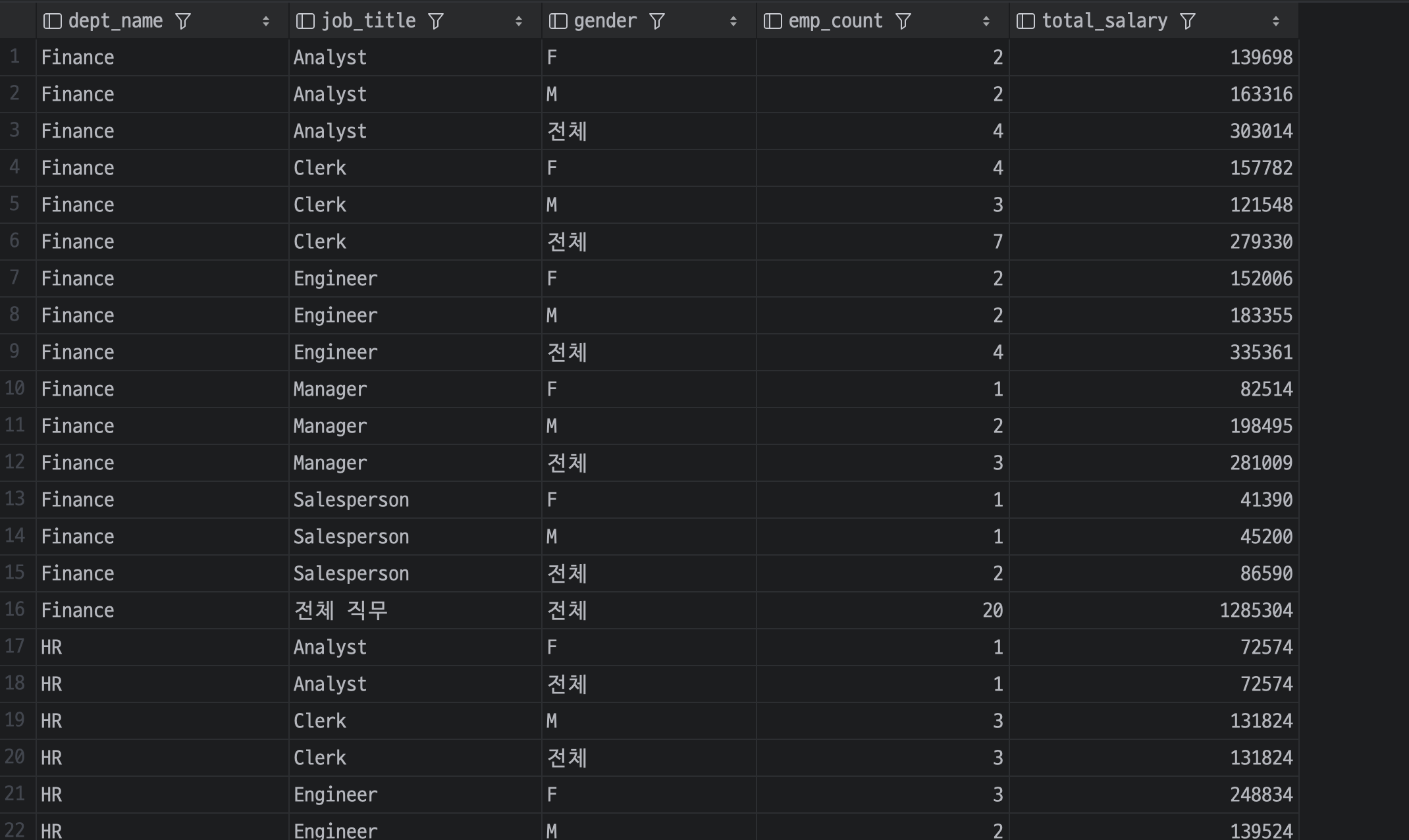 부서별, 직무별, 성별로 직원 수와 급여 합계를 집계하고, 각 부서별 소계(모든 직무 합계), 전체 총계를 출력해보자!