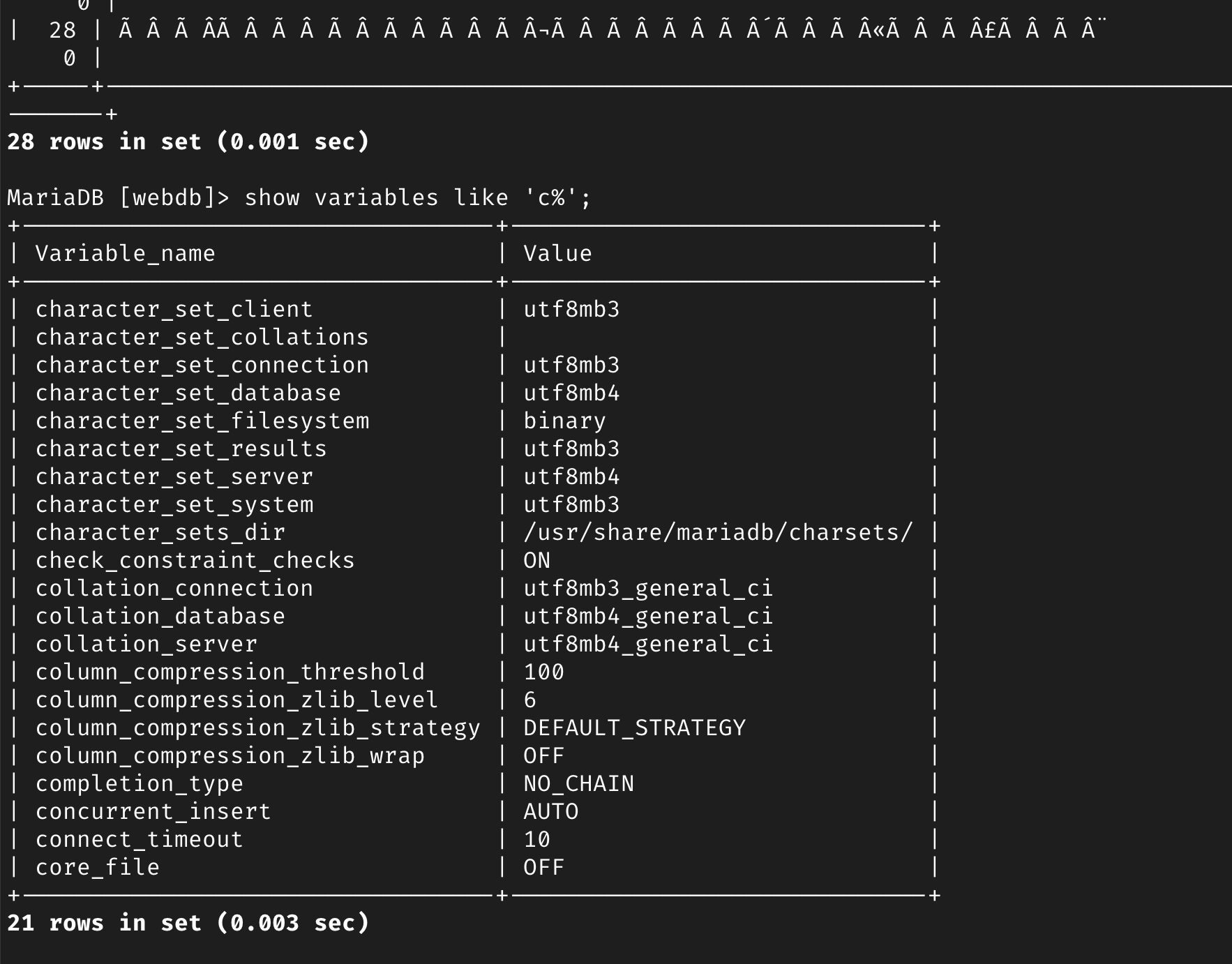 기존 한글 깨짐 show variables like 'c%'; 캐릭터셋 docker exec -it mysql bash bash-4.4# $ cat /etc/*-release | uniq bash: $: command not found bash-4.4# $ cat /etc/*-release | uniq bash: $: command not found bash-4.4# cat /etc/*-release | uniq Ora