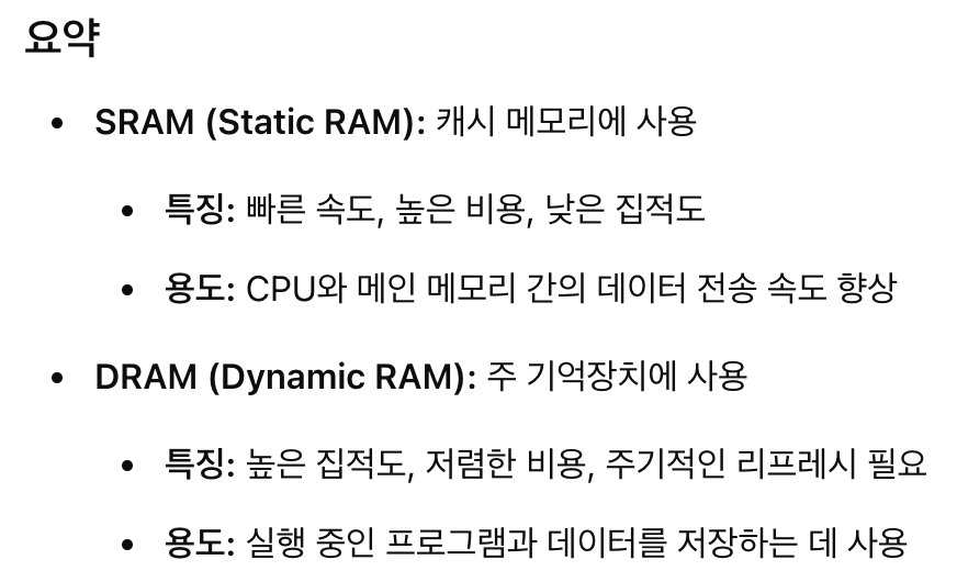 - RAM: SSD/HDD보다 빠르고, 레지스터와 캐시보다 느린 주 메모리.