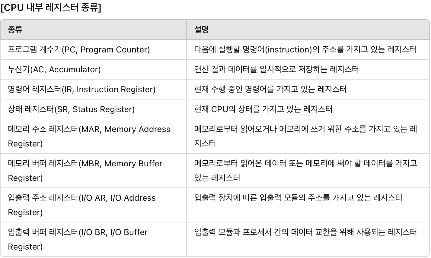 - 레지스터: CPU 내부에 있는 가장 빠른 임시기억장치.